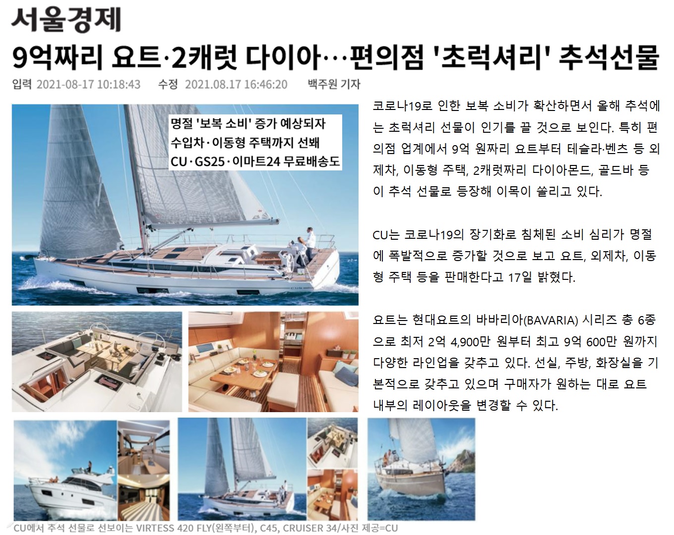 서울경제 _ 편의점 CU _ 9억짜리 요트부터 테슬라, 벤츠, 이동주택 등 _ 초럭셔리 추석선물
